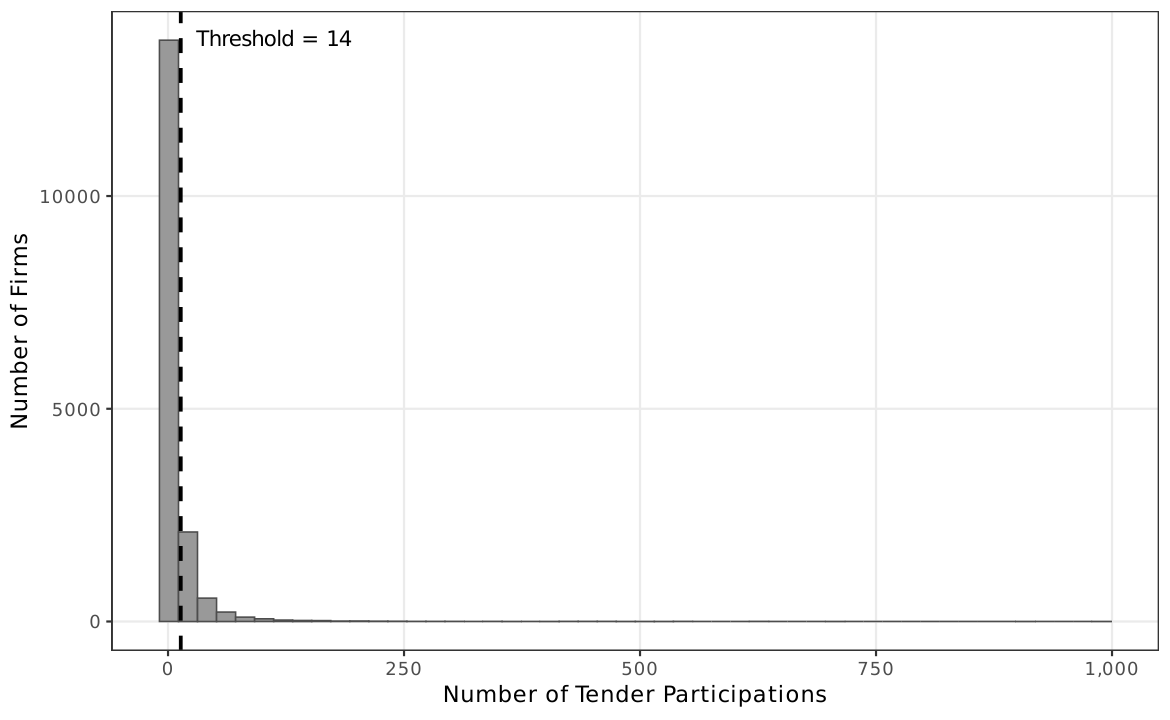 Step 2 --- IQR threshold: Among always-losers, compute median + 1.5 \(\times\) IQR of participation counts \(\approx\) 14 tenders. Firms above this threshold are classified as FL.
