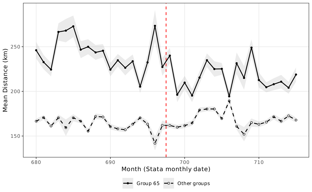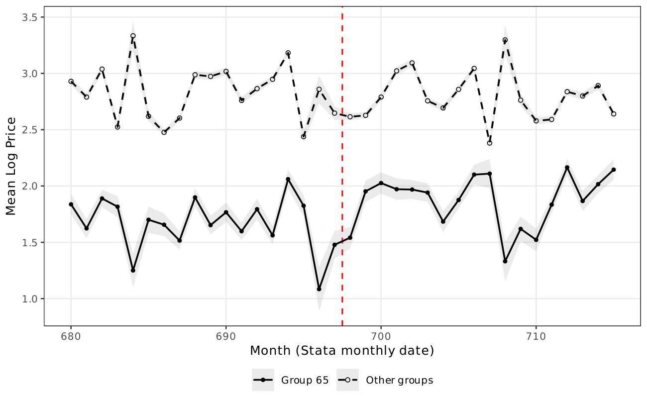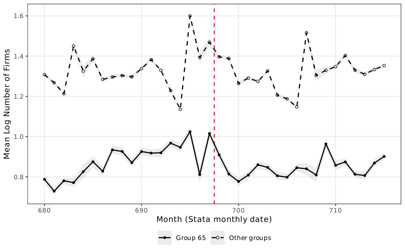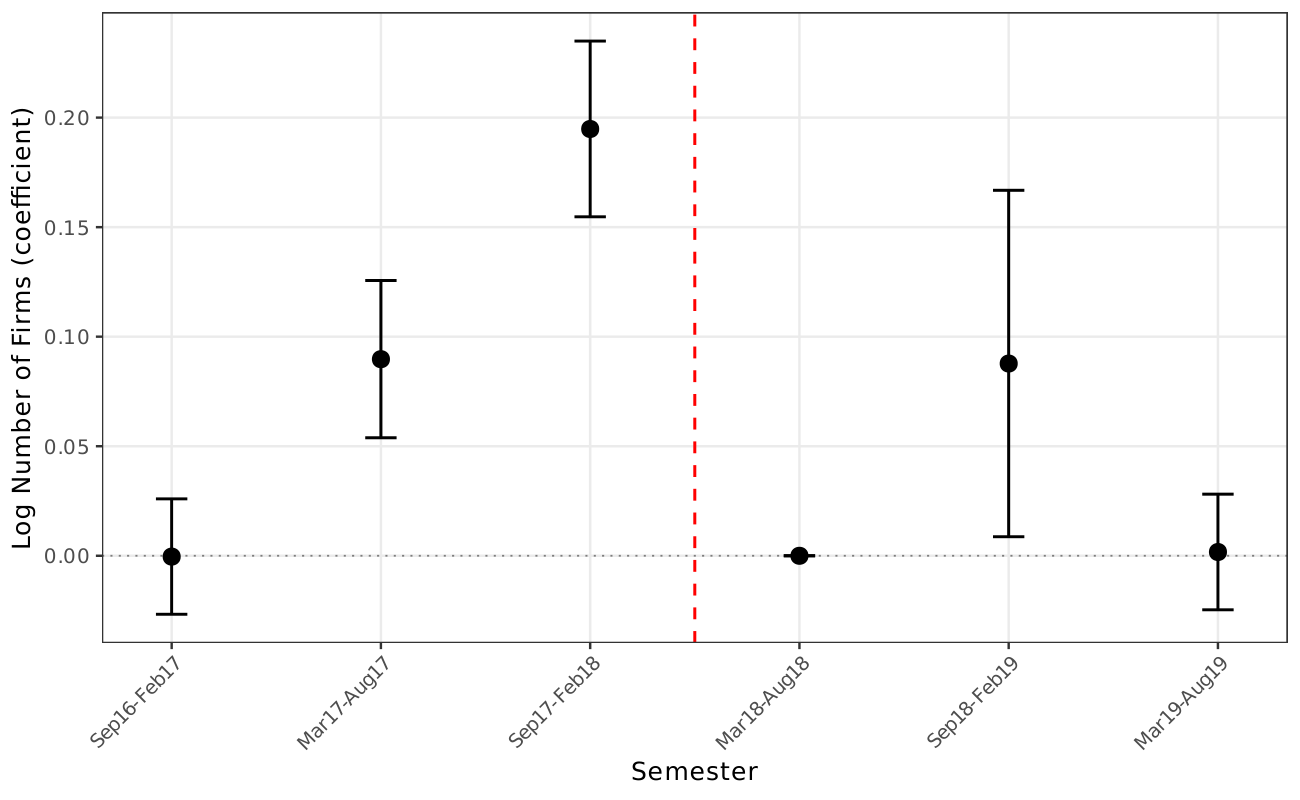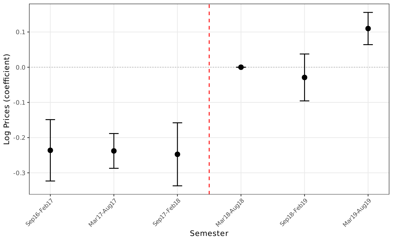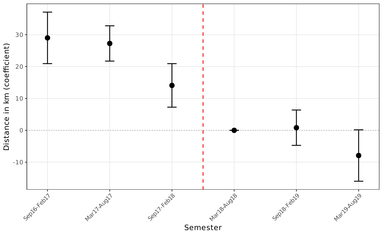 The event study plots semester-by-semester differences between group 65 (switched) and other groups (always treated). The parallel trends assumption requires that the difference is stable in the post-period (after March 2018).