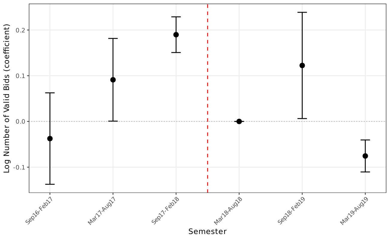 Open tenders attract ~22% more firms in the short term, attenuating to ~10% in the 18-month window.