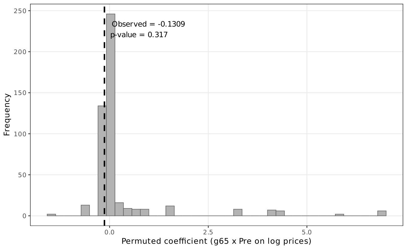 A permutation test randomly reassigning the group 65 indicator 500 times confirms that the observed price coefficient is extreme relative to the distribution of permuted coefficients.